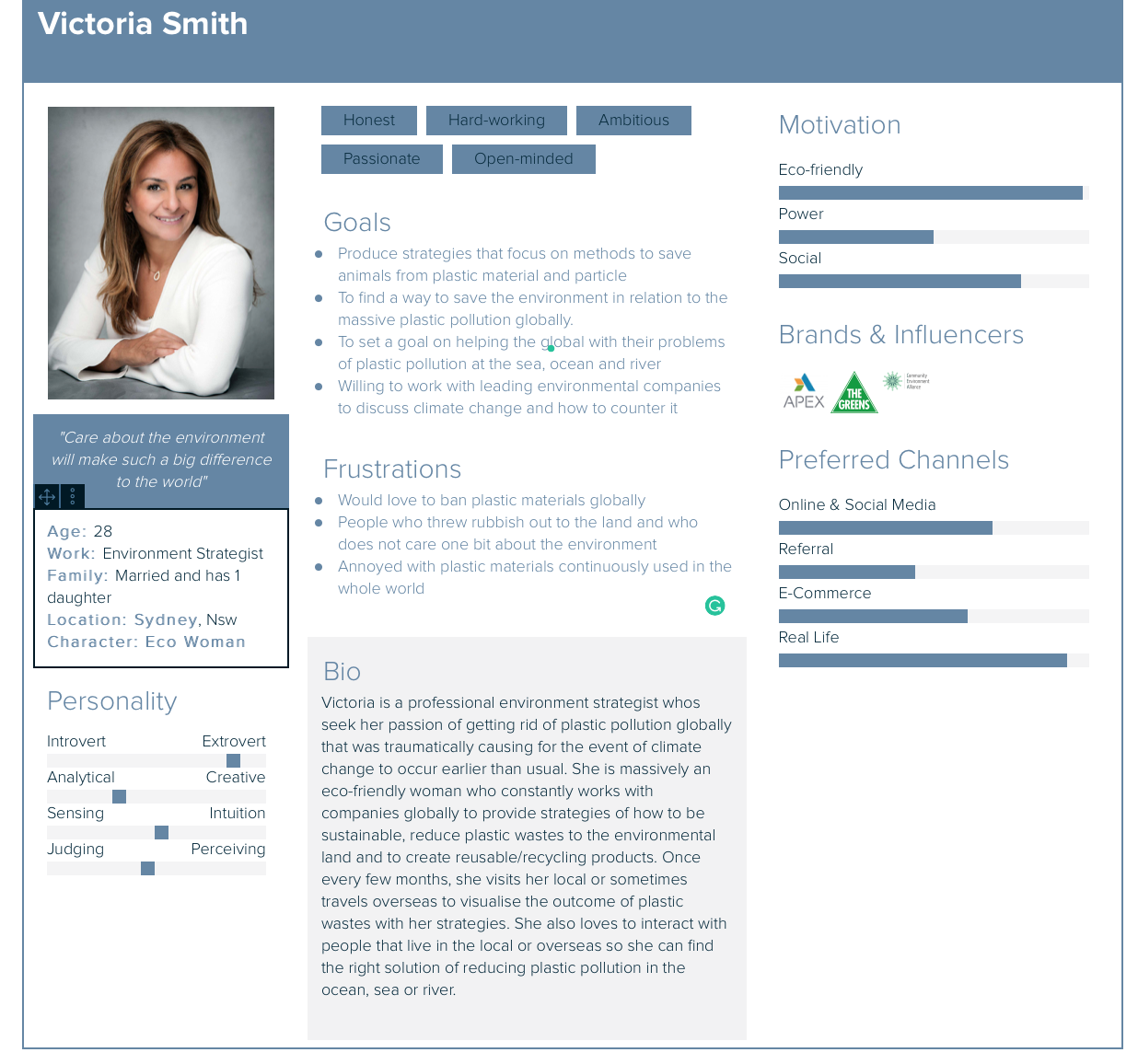 It is on a Monday morning and Victoria is at home working as an environmental strategist to complete daily tasks and suddenly, she has received an urgent email from a global environmental company to work with them about getting rid of plastic pollution in the ocean. She replied back to states that she will come up with varieties of strategies with intensive research to guide her ideas of benefiting and improving on the marine life.