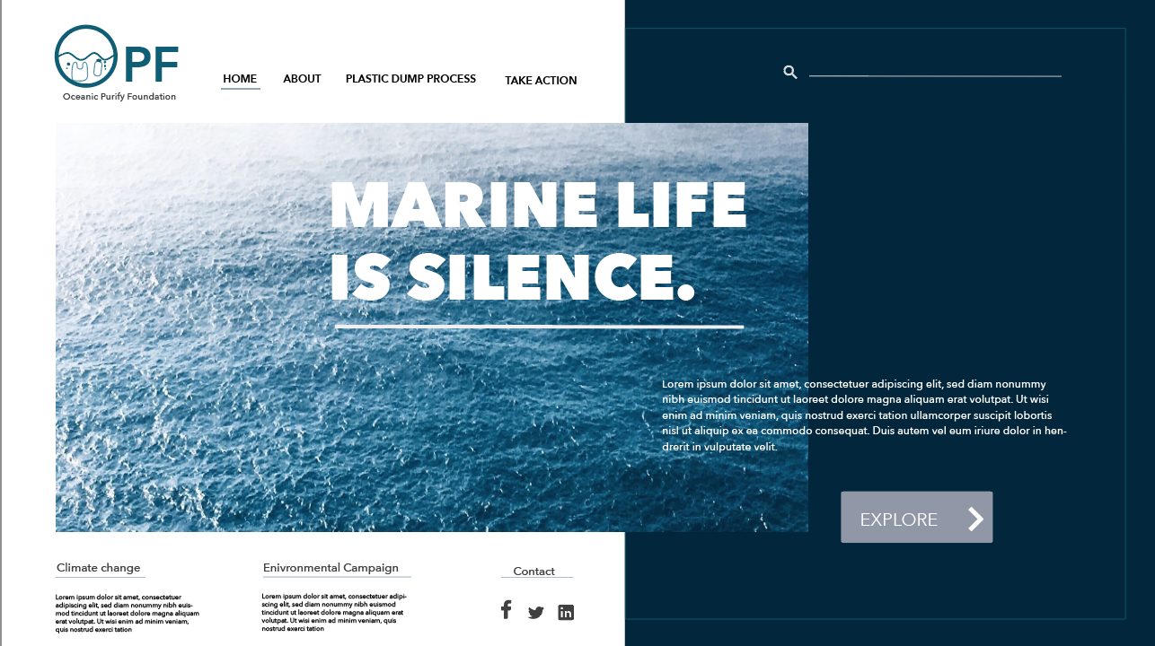 These are my final UI screen designs are for showcasing my intention of creating an informative website about ocean plastic pollution and how it tied to the arising event of climate change. I have also created my own branding in order to value the marine life in the ocean and the aims to deal with plastic pollution as an environmental community.